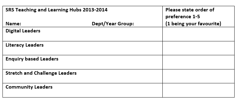 The Hub meetings are led by our ‘Leaders of Learning’ (LoLs). There should be representation from every Dept/Year group as LoLs, if you are interested in becoming a Leader of Learning or finding out more about this role then see Rachael Edgar, the T&L Leader.