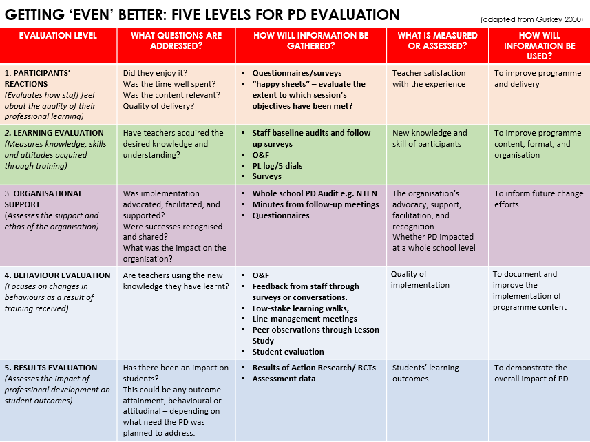 Ideally we want any aspect of our PD programme to reach levels 4 and 5, in that it leads to positive changes in teacher practice and improves student outcomes.