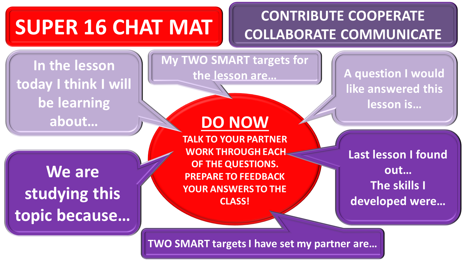 Begin every lesson with 5 question to include a mixture of lower order and deep level questioning. Relate these to the Super 16.