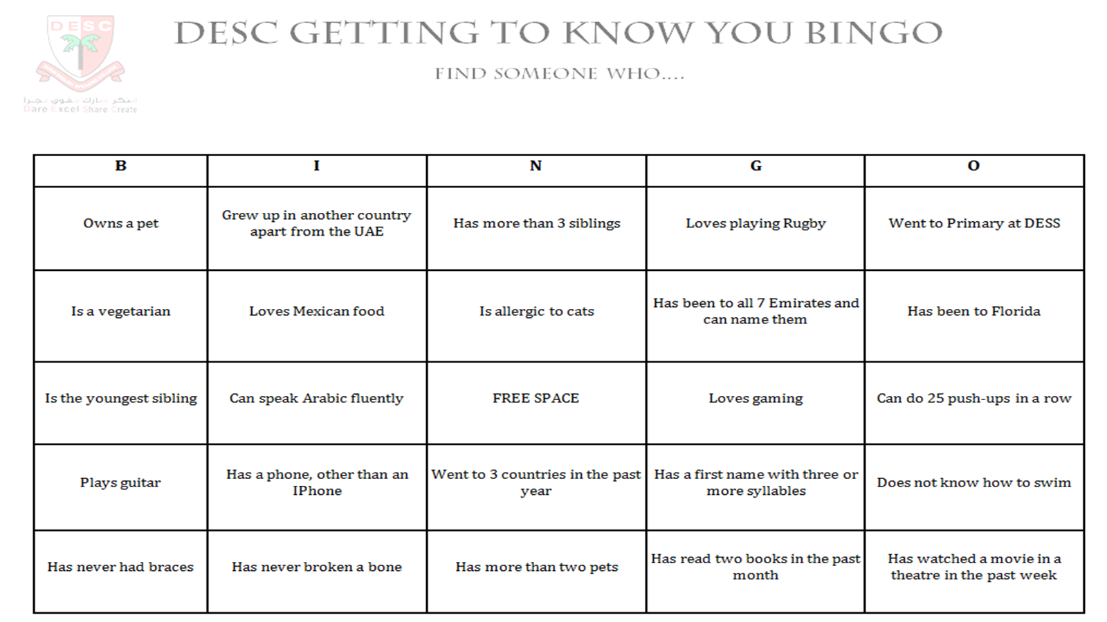 Give each student a ‘’bingo’’ card, they then move around the classroom trying to get their bingo cards filled up with names and answers to the questions. Decide as a class before what the completed game will be, e.g all squares= ‘blackout’, 5 in a row, outside boxes= ‘picture frame’, boxes around the free space = ‘box square’. Etc