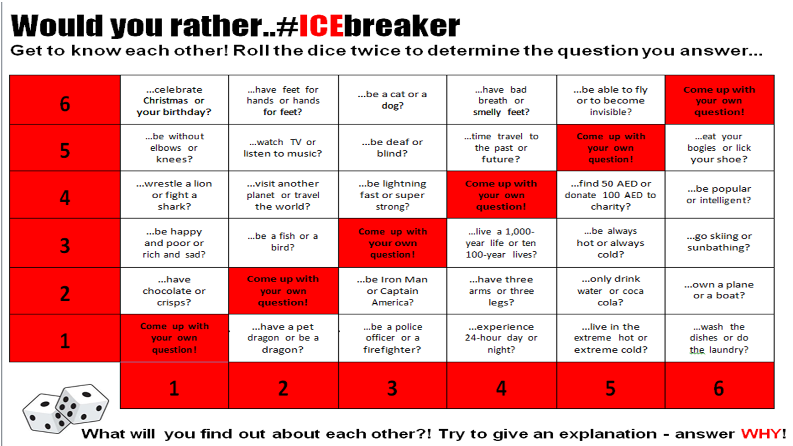 This game can be played with or without dice, students land on a square and then have to choose which they’d rather, for example, “would you rather be popular or intelligent’’? There are a number of variations to this game which can be played as whole class/groups/ pairs or with students wandering around the room to question each other.